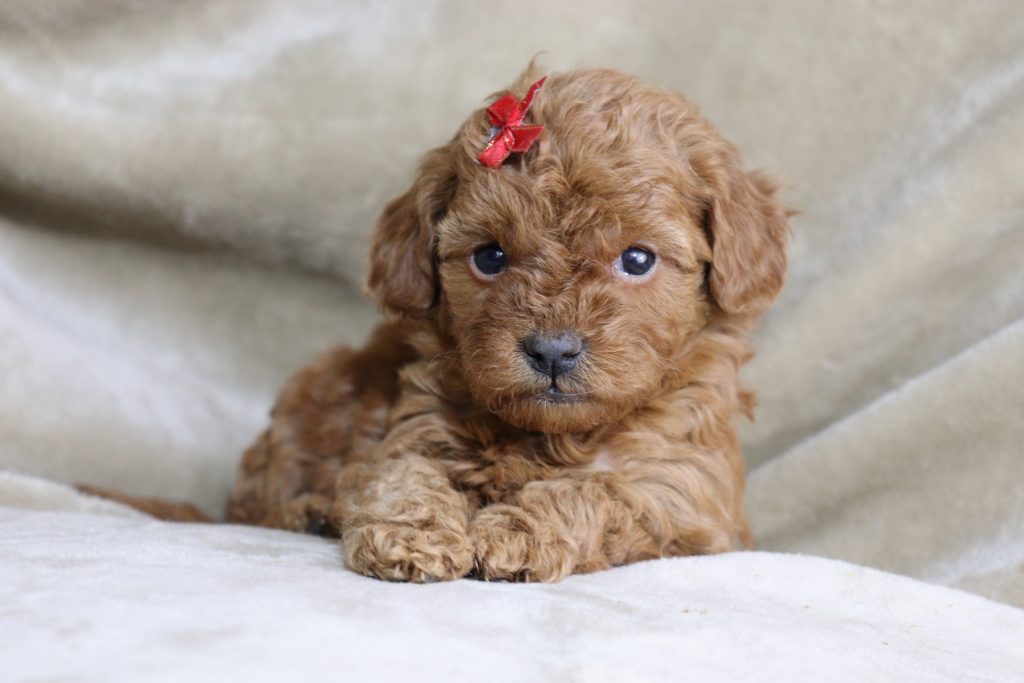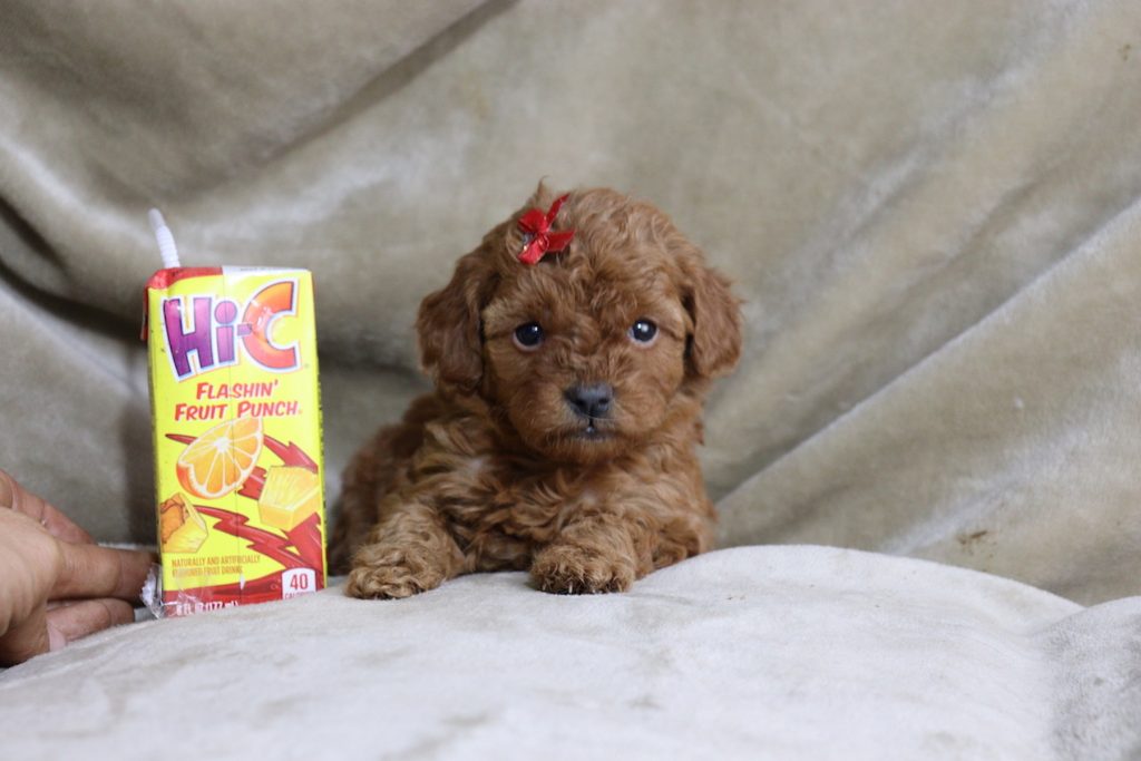 Teeny tiny teacup Goldendoodles!! Currently weighing just 1lb 10oz at 5 weeks old! So they are on track to be between 8 – 12lbs full grown, hypoallergenic and non-shedding!! Family raised, one of a kind, affectionate teddy bear Goldendoodle puppies looking for their furever families! Each puppy is friendly and playful, but they love snuggles and cuddles most of all!